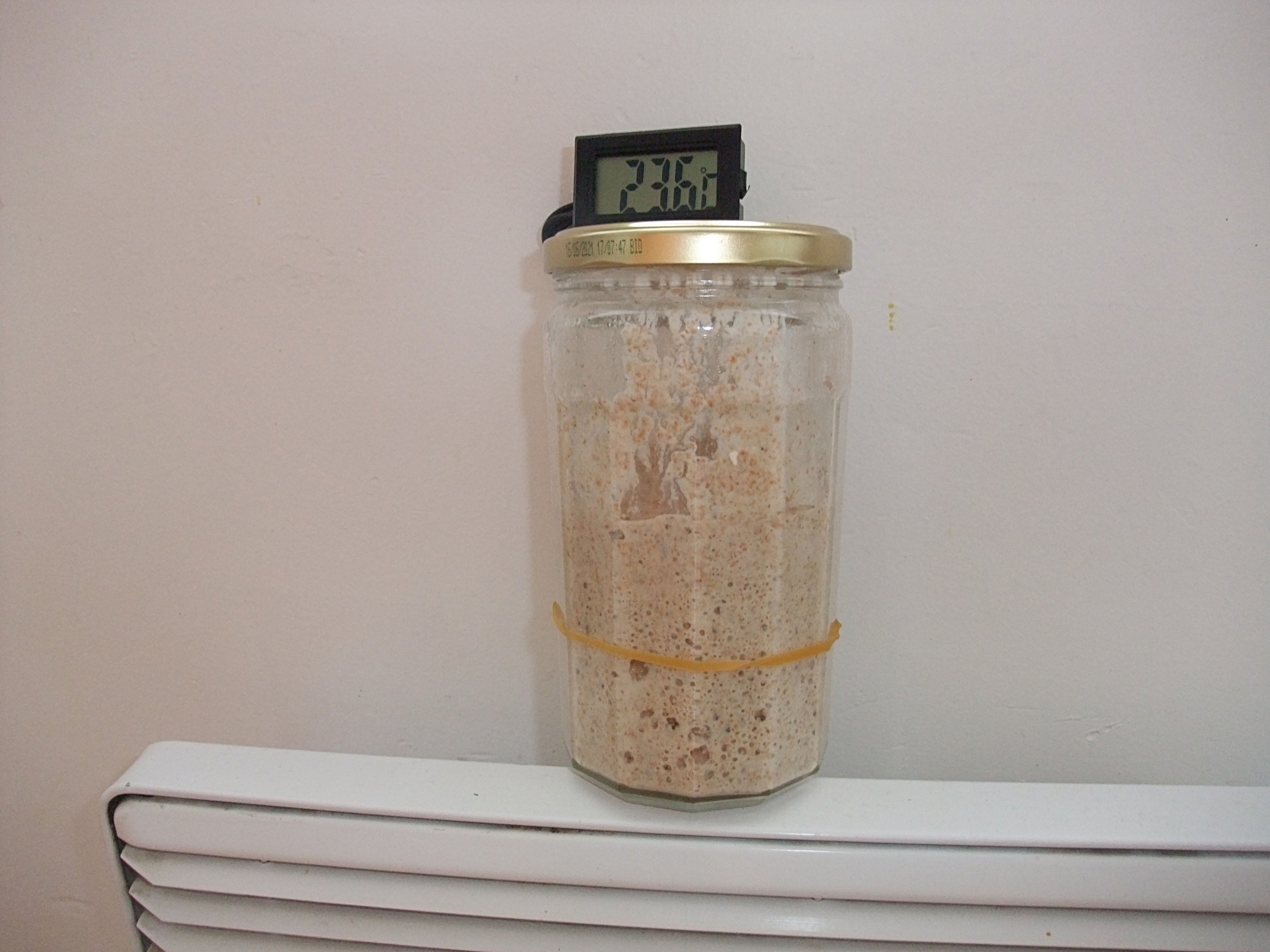 L'élastique est le niveau de ce matin, au rafraîchi du levain, où j'ai mis 1/4 d'eau et 3/4 de farine T150
